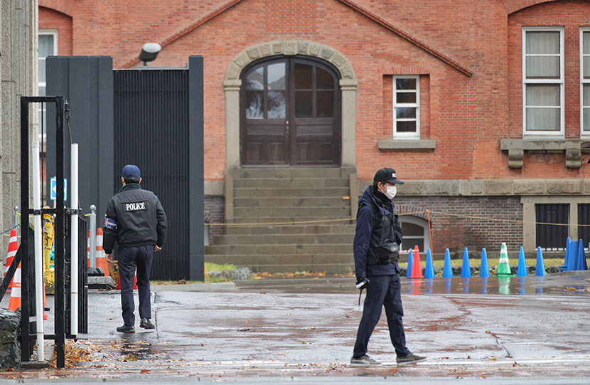 庁舎内には警察車両も待機。この日は道庁周辺を政治団体の車両が