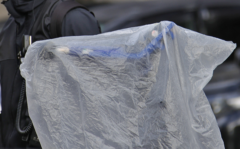 時折雨が降る状況。街宣車からの音量を測定する為の集音マイクには