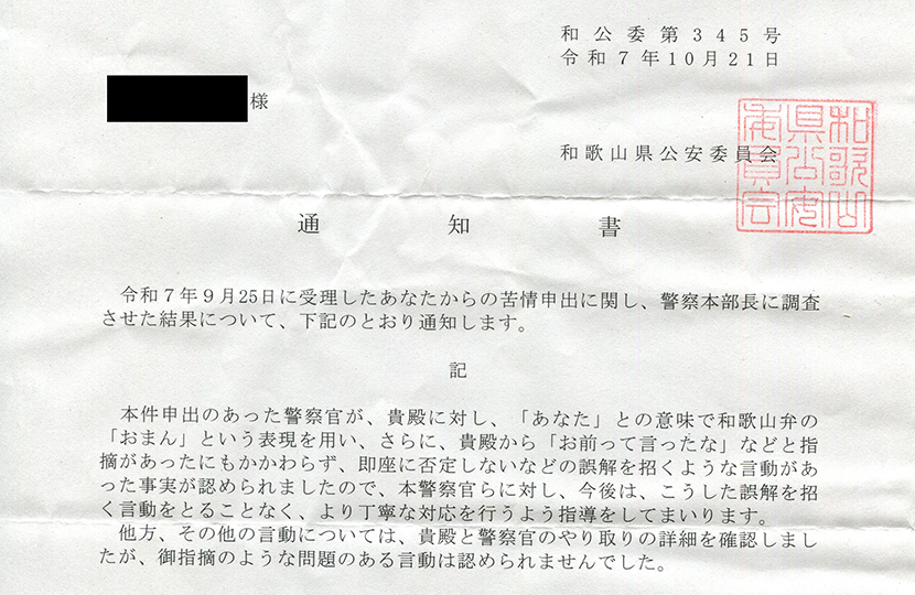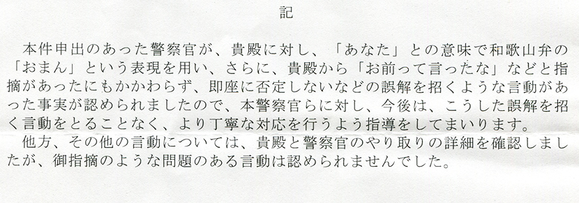 警官が市民に「お前」と発言した件について公安委員会が言い逃れ 和歌山県