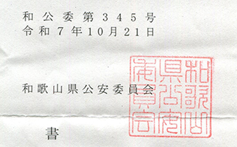 当サイト情報提供者の方より頂いた和歌山県公安委員会からの通知書