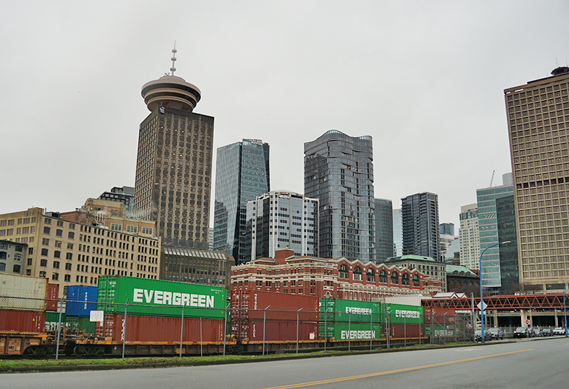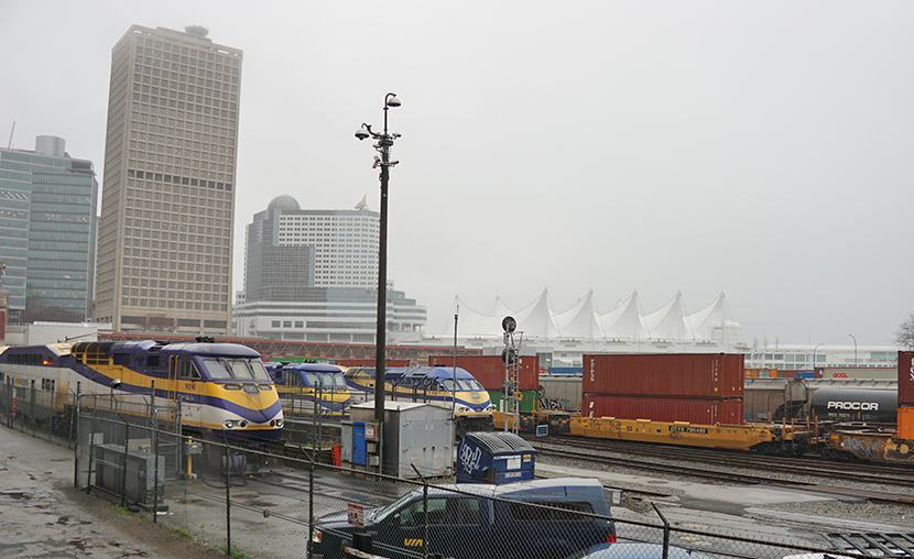 バンクーバー ウォーターフロント駅からの眺め。左に見える青色、黄色、