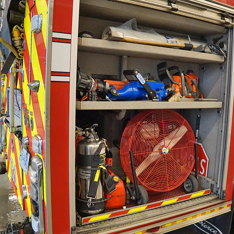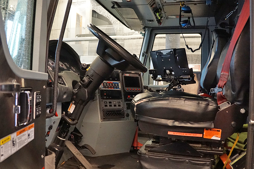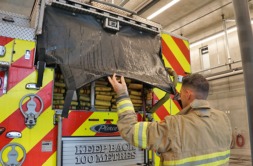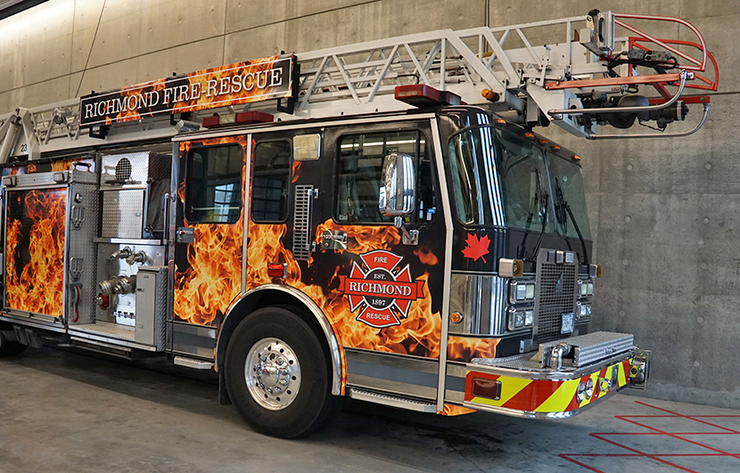炎のラッピングが施されたはしご車。戦うべき相手が車体に描かれて
