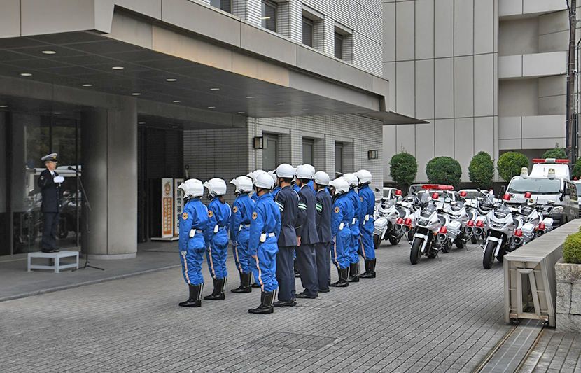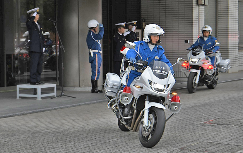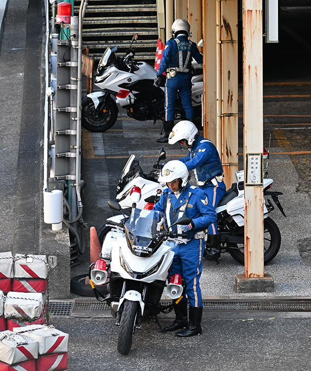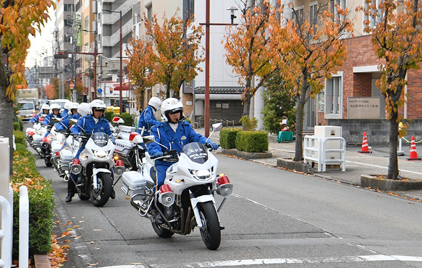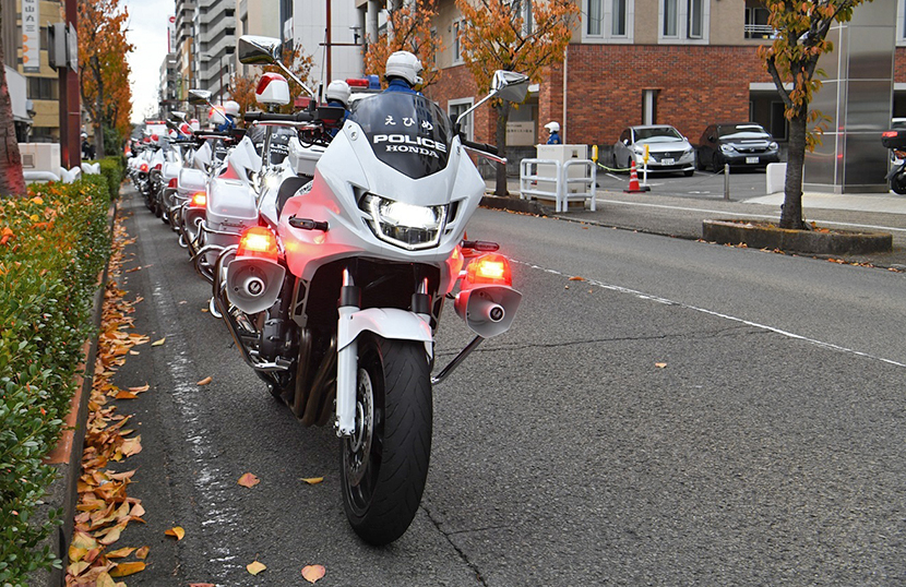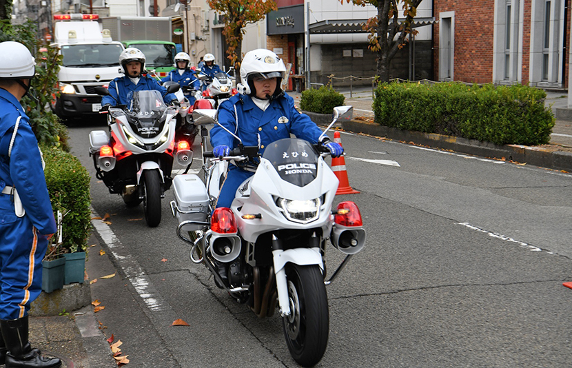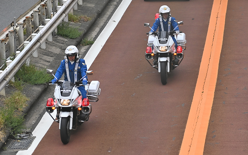 通常は単独での活動が多い白バイだけに、集団行動していると何か