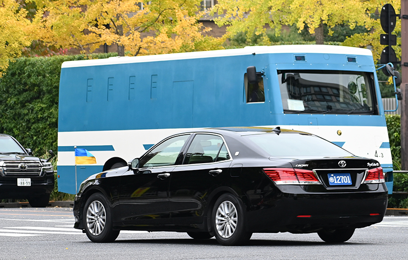 嬉しい外道、210系クラウン外交団車両。フラッグポールにはウクライナ