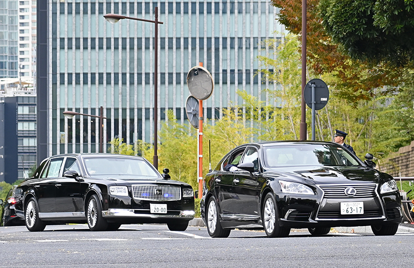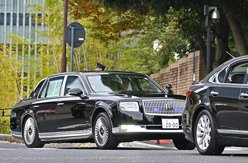 後続に3代目センチュリー内閣総理大臣専用車。グリル越しに青色の