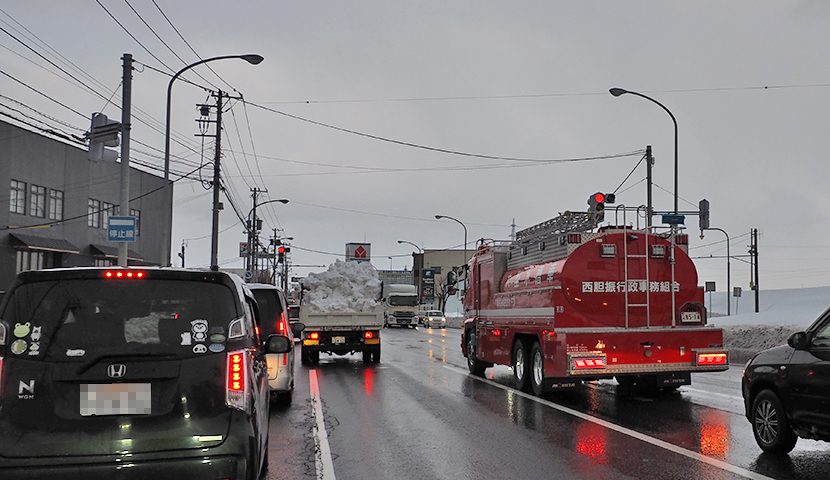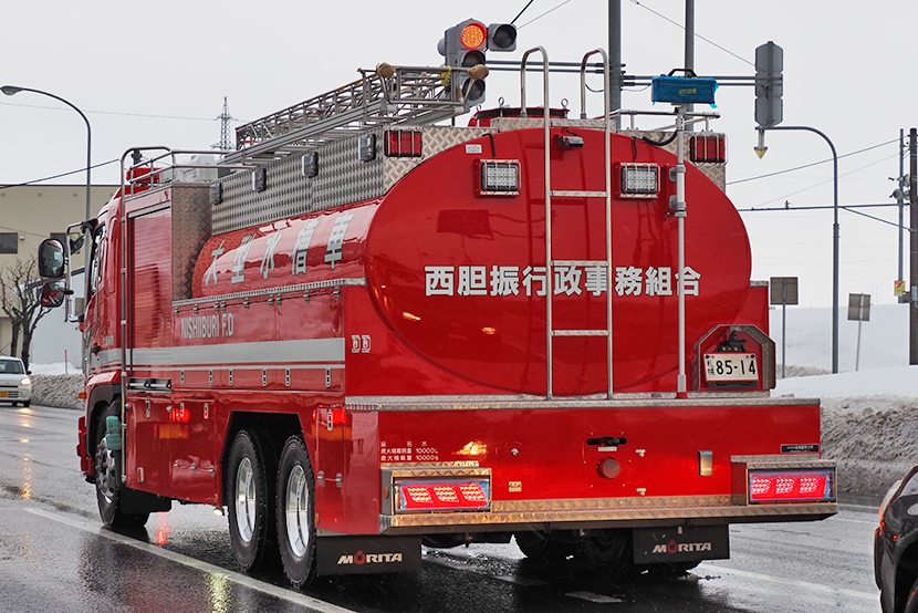 大型水槽車。撮影は札幌市東区という点、車体後部には西胆振行政事務組合