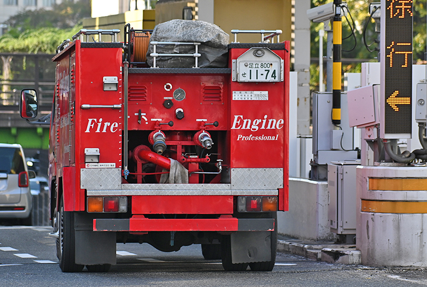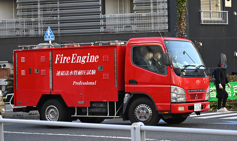 分駐付近を走行の消防車両。「連結送水管耐圧試験」のマーキング。