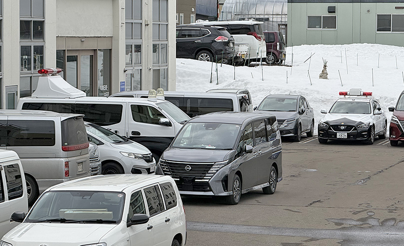 庁舎内には警察車両も待機。この日は道庁周辺を政治団体の車両が