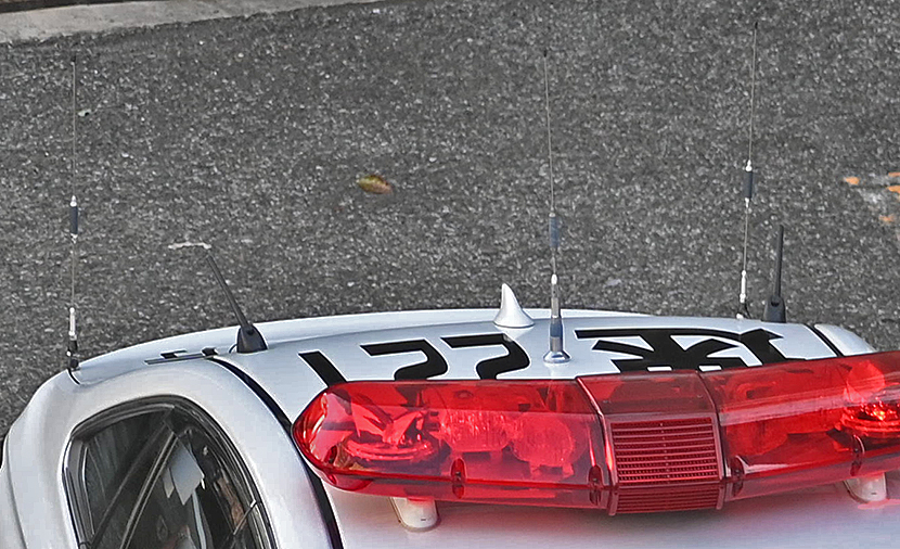前面警光灯がナンバー両脇のグリル越しに確認できる。非点灯時は