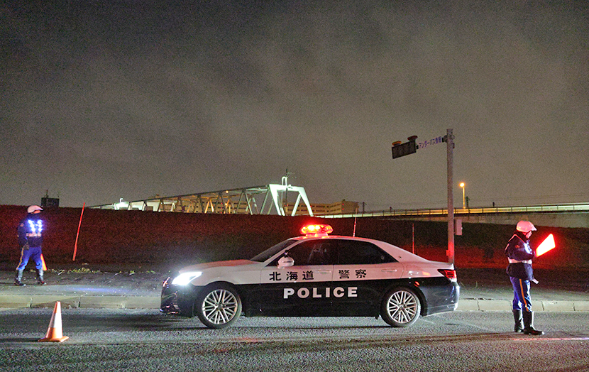 検問会場奥には豊平川にかかる上白石橋が見える。トラス橋と呼ばれる
