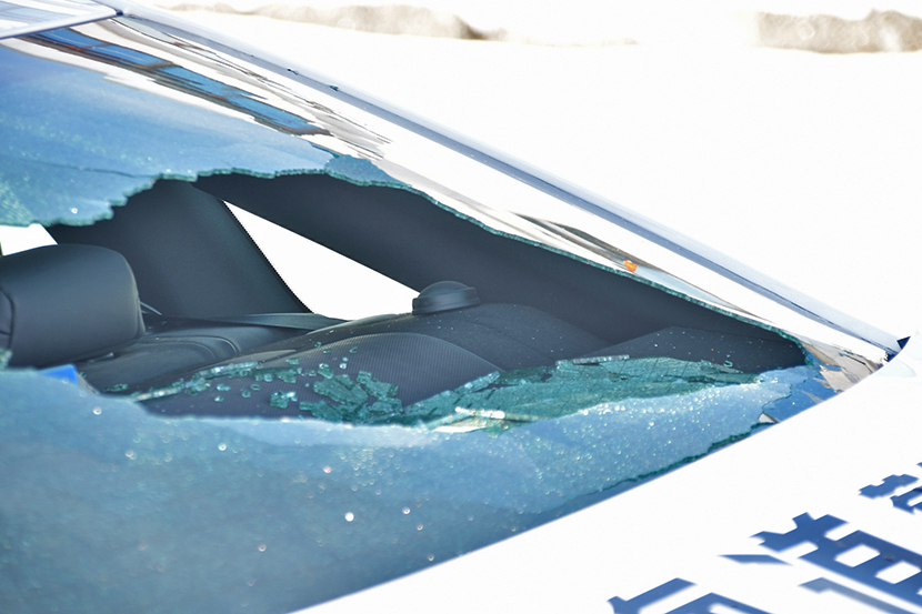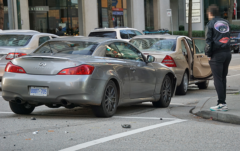 追突事故。路上には当事車両の破片が散らばる。事故というのは