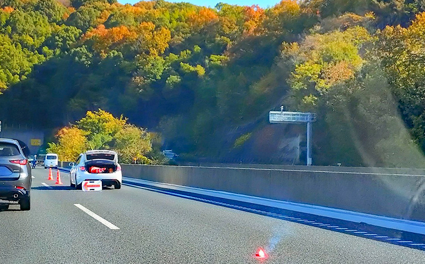 ございます。第2車線に発煙筒が焚かれているのが確認できる。撮影は