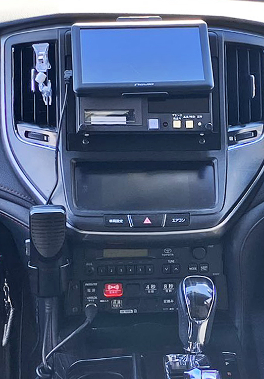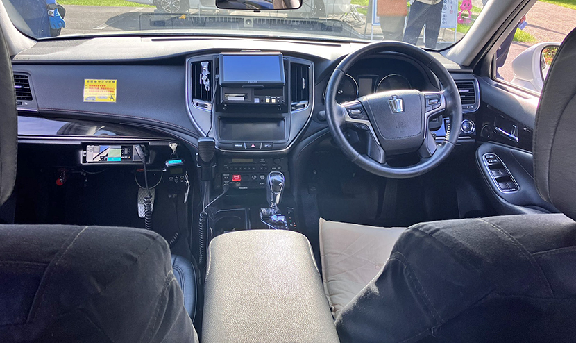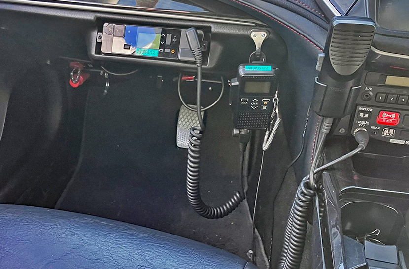 ダッシュボードには無線機。足元にはフットサイレンのペダル。
