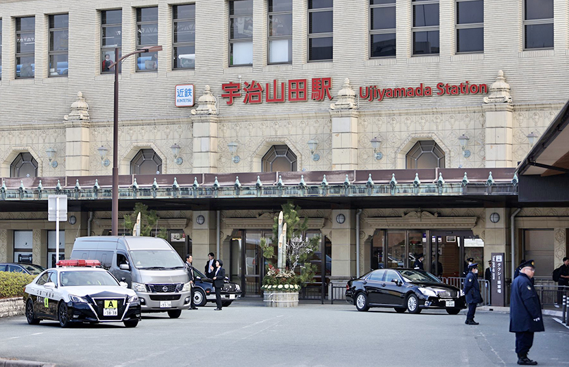 総理が降り立つ宇治山田駅。お迎えの車両が待機。