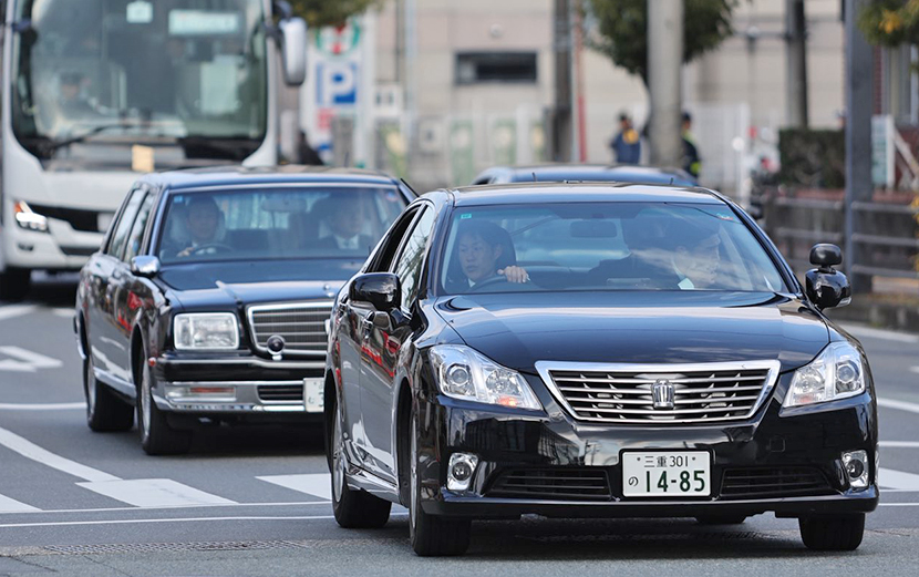 出発。200系クラウン警護覆面。その後ろには内閣総理大臣専用車両。