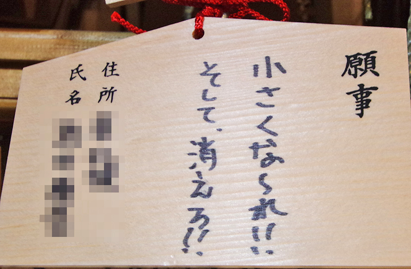 「ワキガ治りますように」臭そうな絵馬。絵馬に臭いなすり付けて