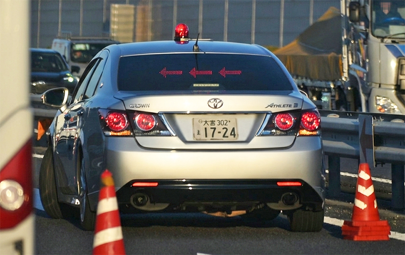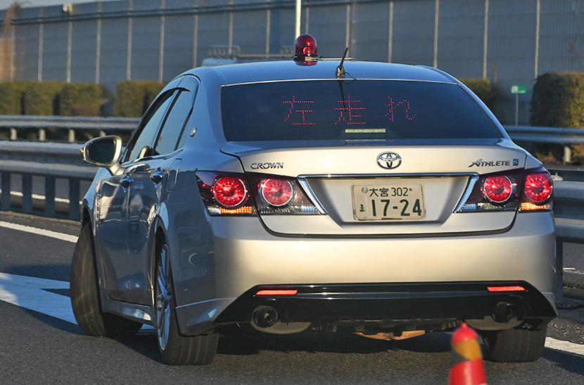 埼玉県警高速隊所属210系クラウン覆面。パトサインは「←←←」を