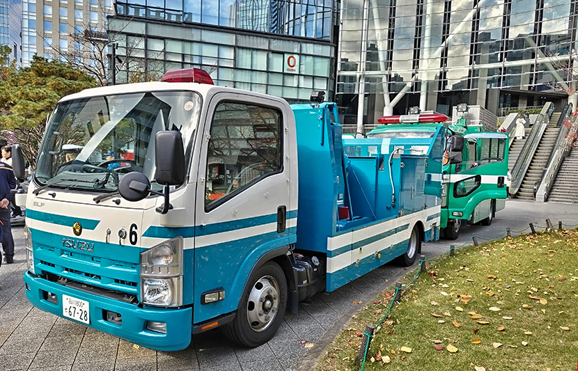もう1台の当事車両。その横にはドラえもん服の隊員2名が写っている
