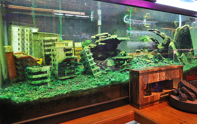120センチ水槽。向かって左半分は廃墟、右半分は石組みのレイアウト。