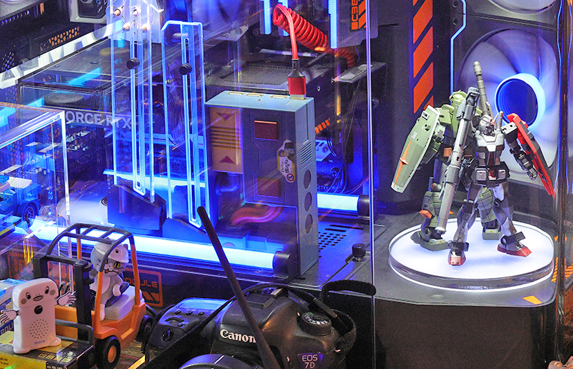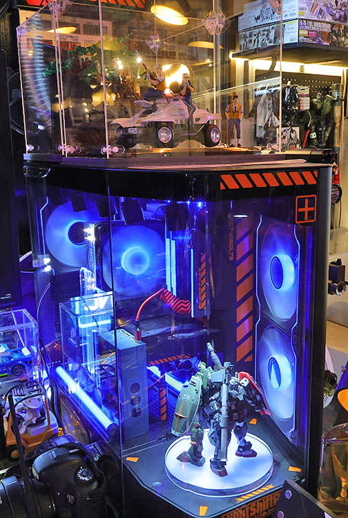 パソコン内部にもガンダム。お立ち台は回転する。また、「これをパソコンの