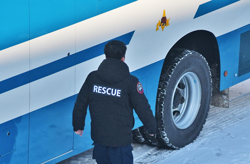 警備に駆り出される警官を大量輸送してきた大型人員輸送車。