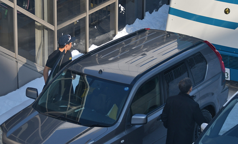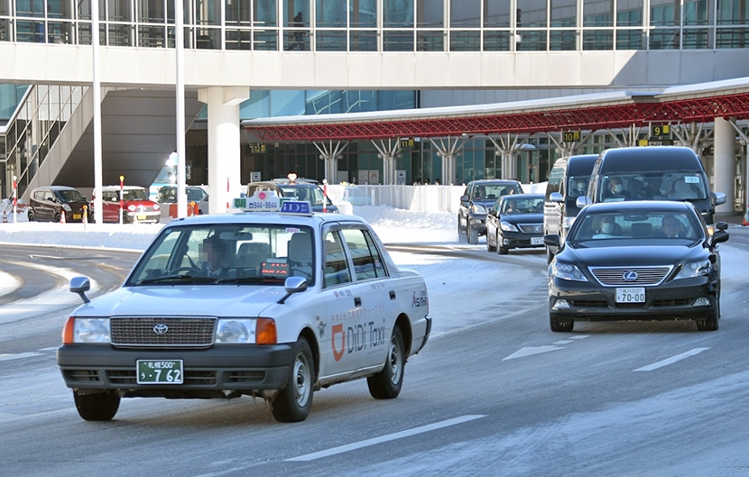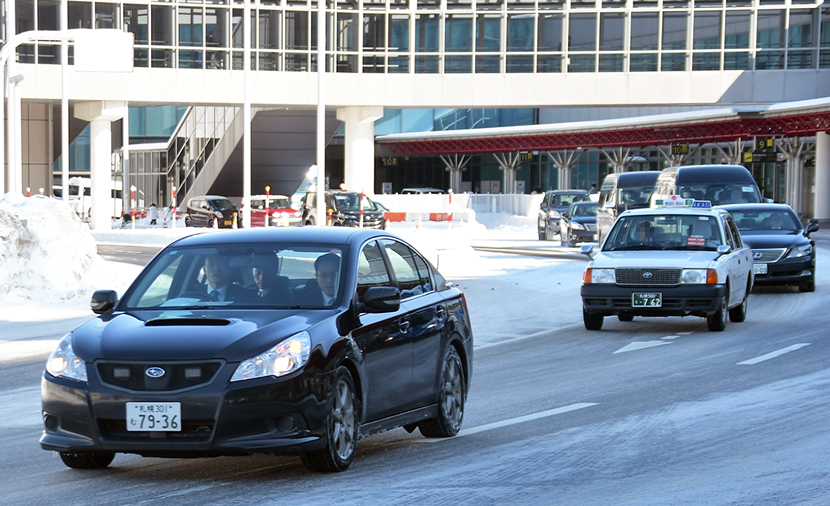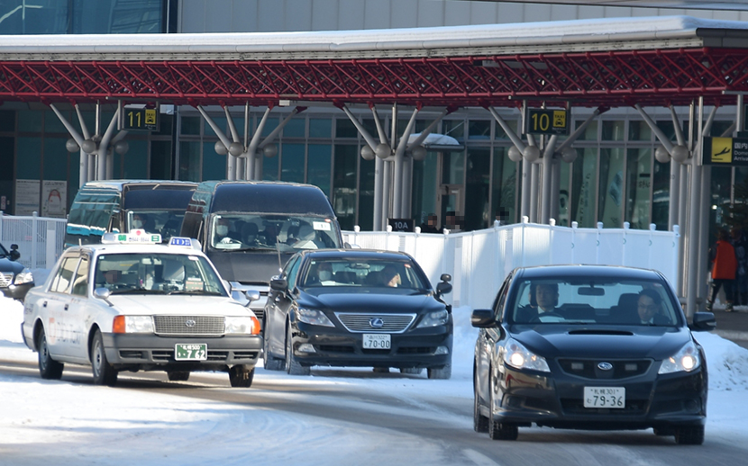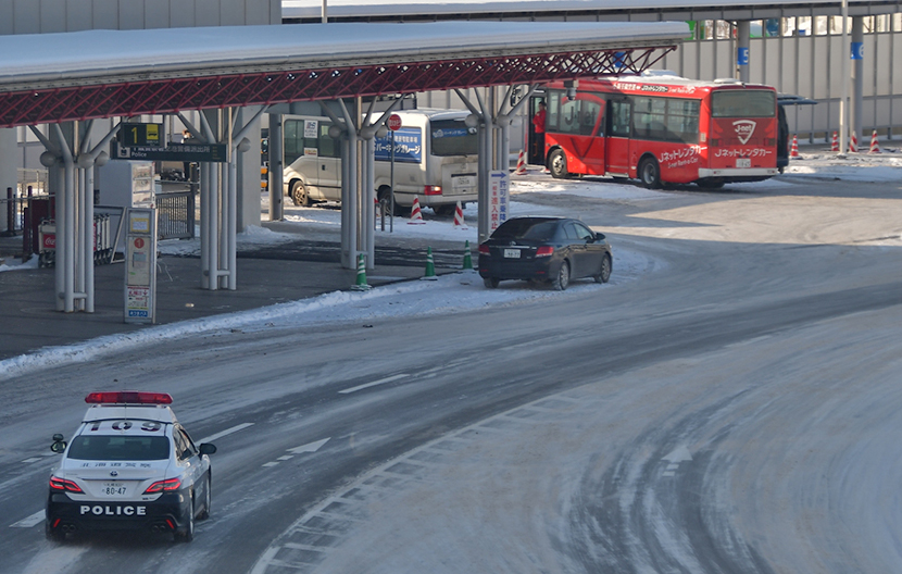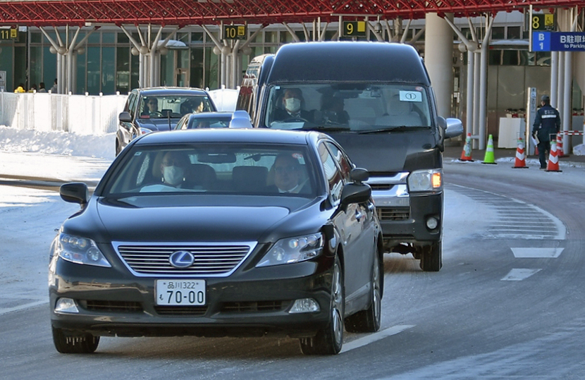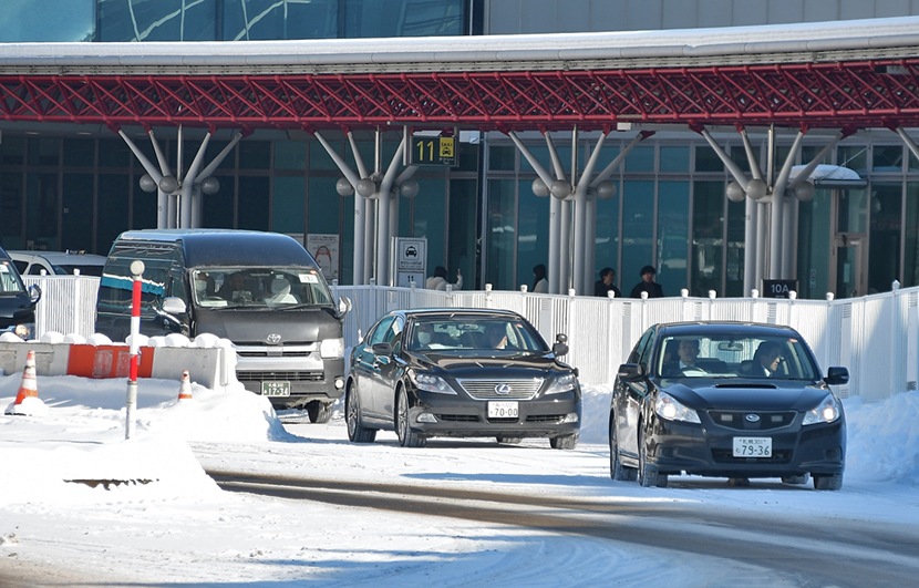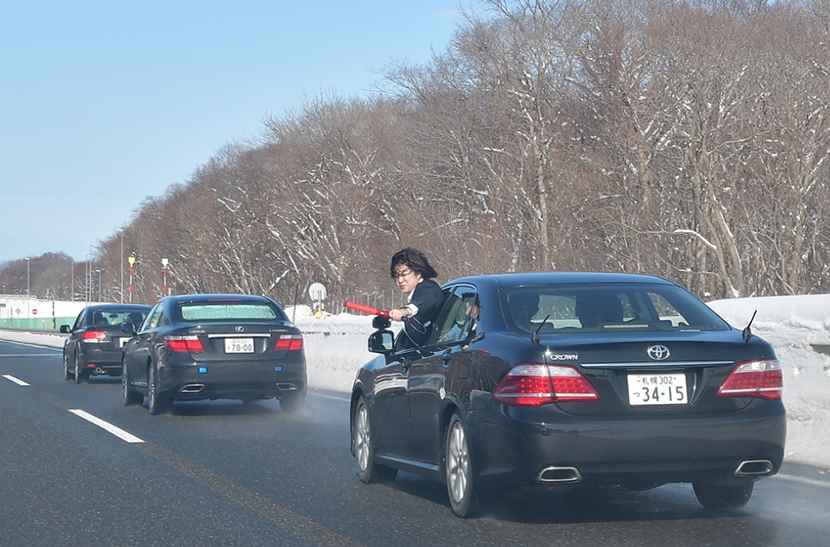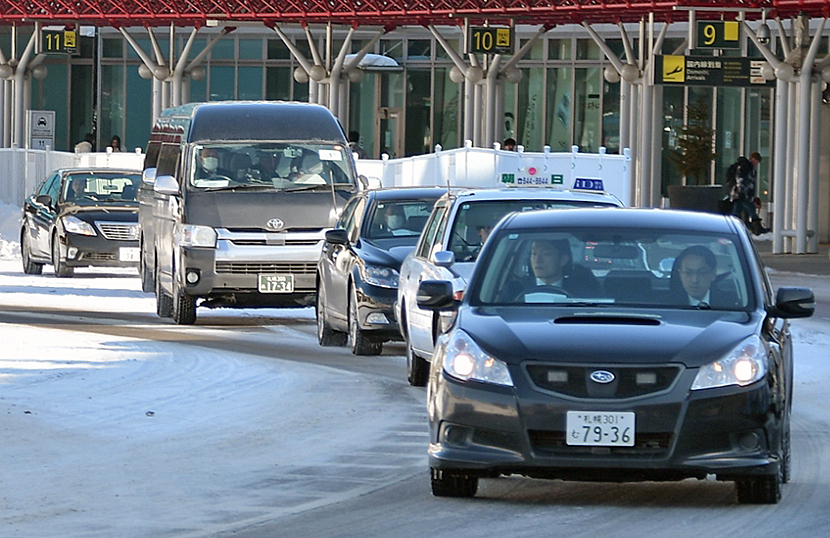 本人をピックアップして「本物の」車列がスタート。新千歳空港を