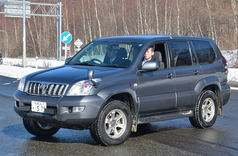 150系ランドクルーザープラド警護覆面。MKタクシー仕様。※背後に